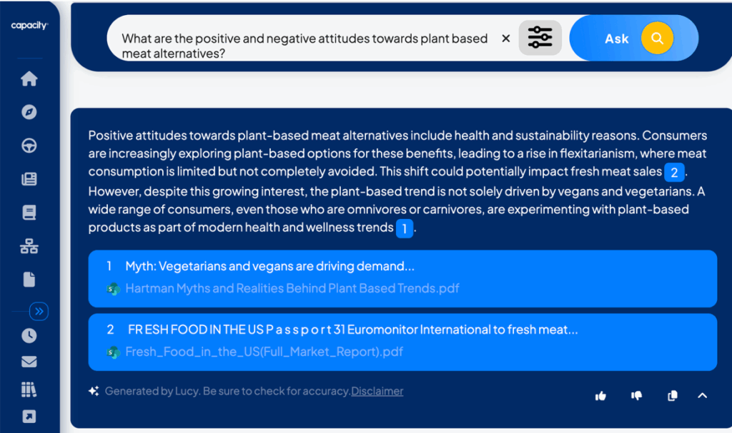 When we tackled this challenge with Capacity Answer Engine—an enterprise knowledge management platform that works with a company’s own or licensed data—we put citation and verification front and center. In the product, citations are prominent and inline, making it clear where any fact, stat or conclusion comes from. Clicking a citation takes you directly to the exact page of a document, slide in a deck or moment in an audio or video file.